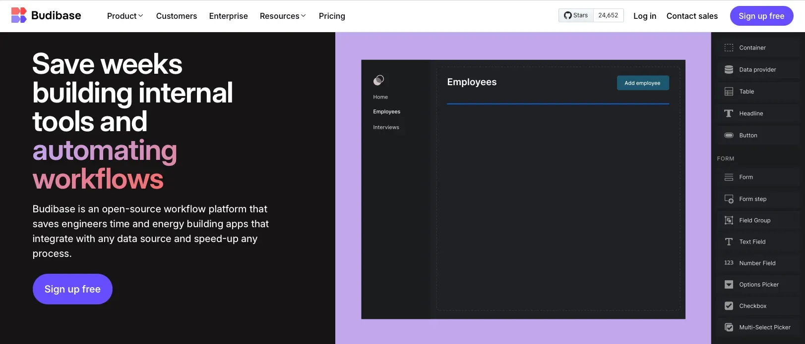 Budibase is an open-source internal tool builder that gives teams the ability to ship apps fast with a modern no-code approach. It’s designed to support both technical and non-technical users, offering a visual UI builder, support for SQL and REST APIs, and the option to self-host for free or deploy in the cloud. Because it’s open-source, Budibase appeals to teams seeking transparency, control, and the ability to tailor their stack to their exact needs.