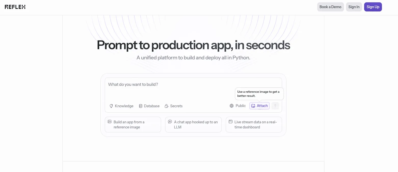 - Built for Enterprises: Reflex’s AI app builder integrates easily with your company data and with Github.