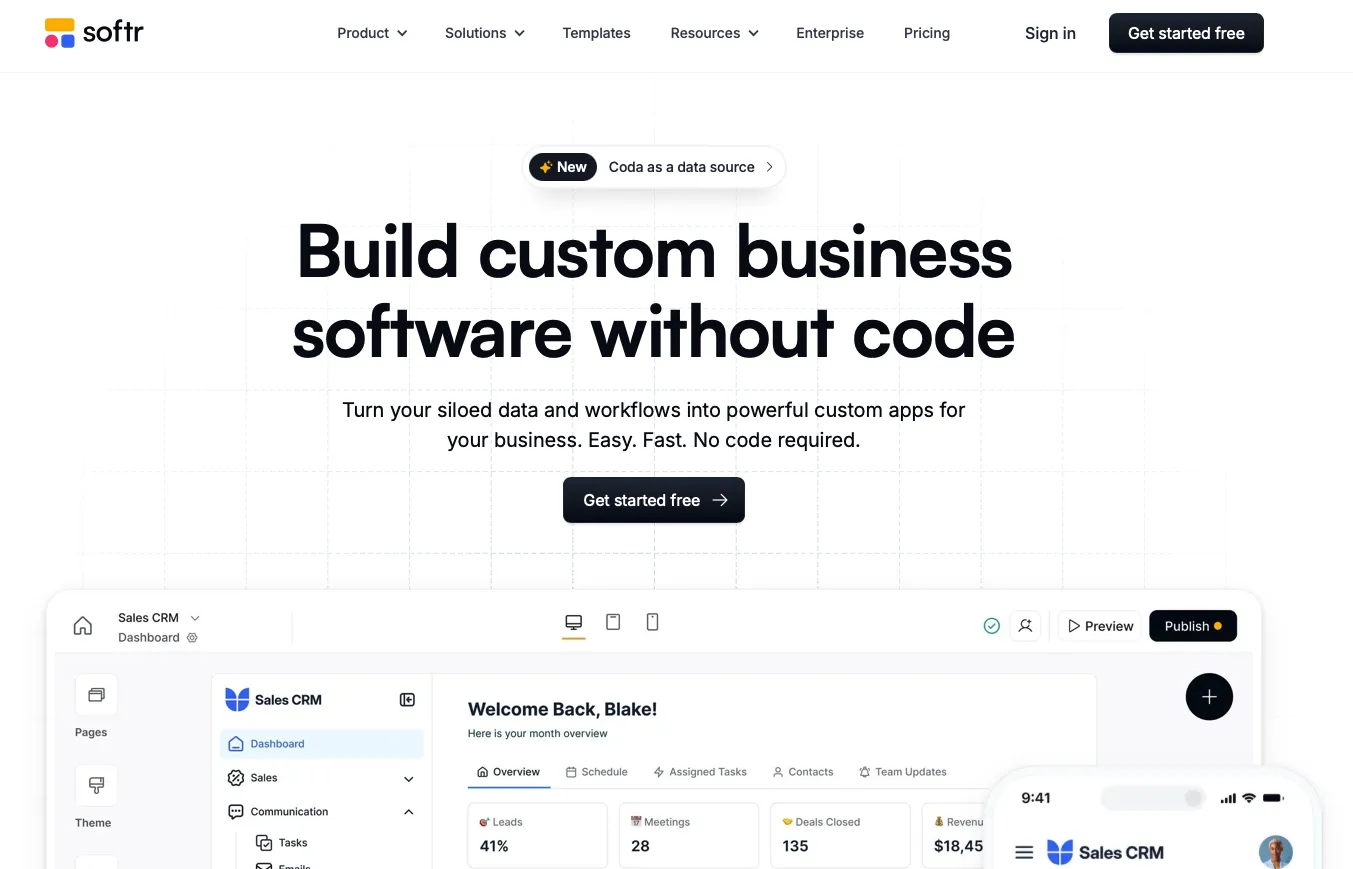 Softr is a no-code platform that helps teams turn their data into fully functional internal tools using AI. Built specifically for non-technical users, Softr offers a clean drag-and-drop interface, user authentication, permissions controls, and ready-made templates for common use cases like CRMs, project trackers, and employee directories. It integrates natively with Airtable and Google Sheets, so if you’re deeply invested in those ecoystems, Softr may be a solid pick.