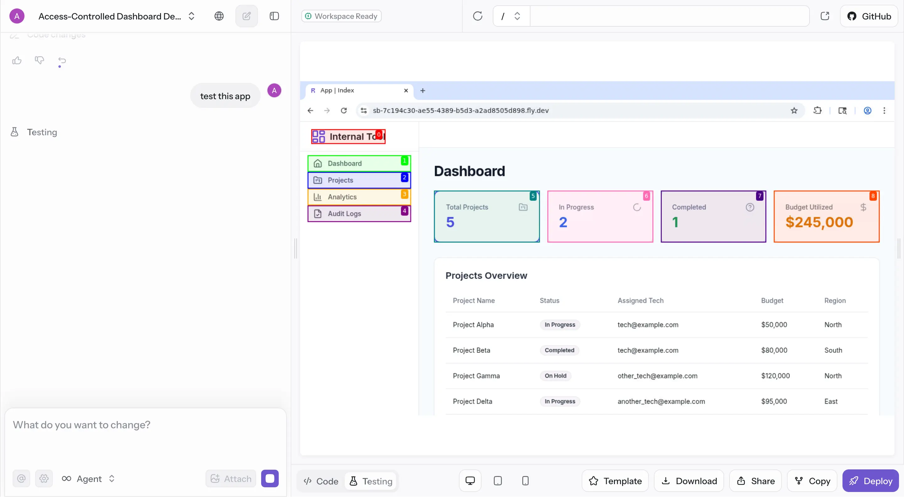1. Start Testing: Type "test this app" or similar command to activate testing mode