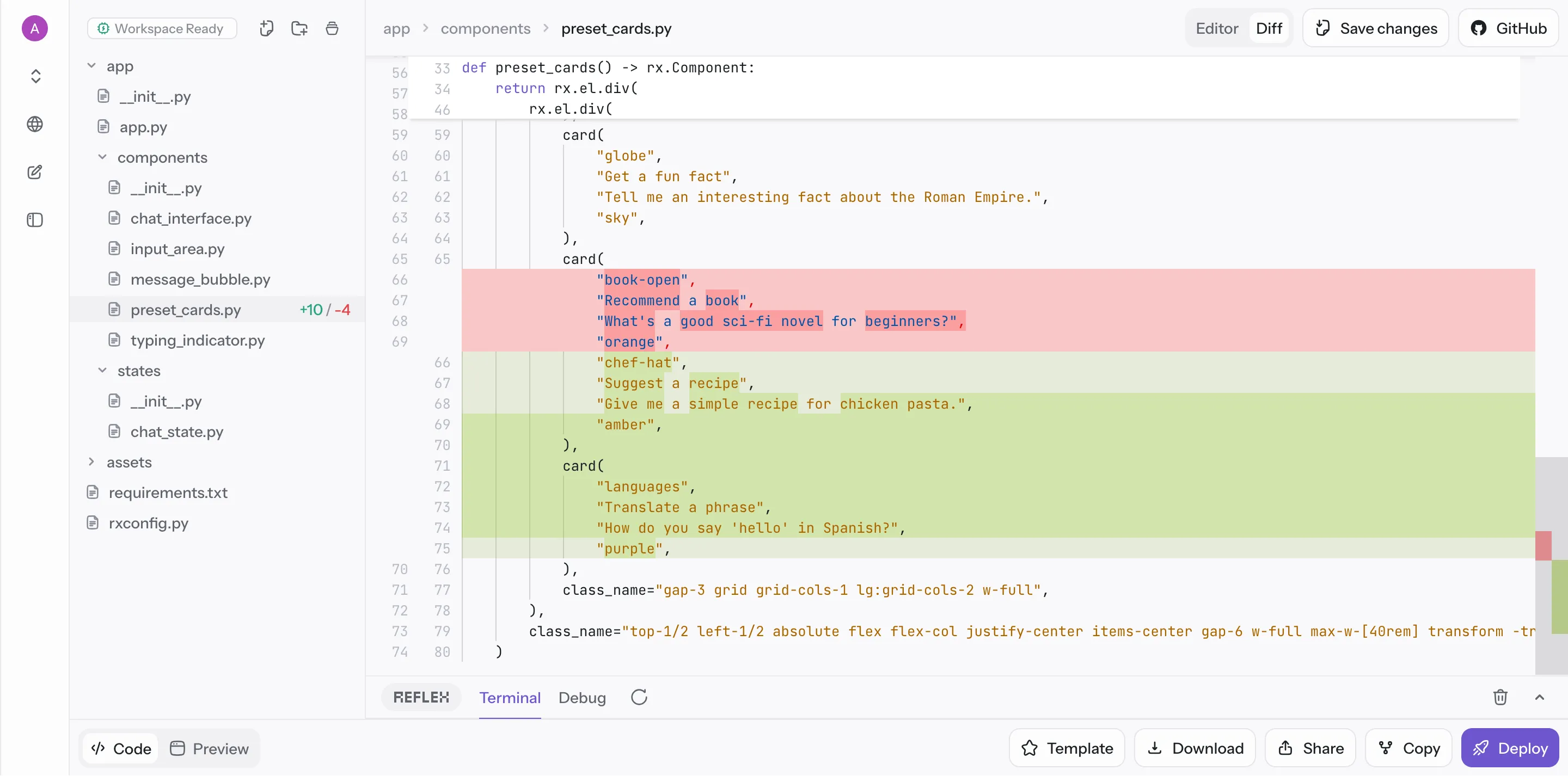 The AI Builder includes a powerful dual-mode editor that lets you view and edit your application code while tracking changes made by the AI. You can seamlessly switch between Editor Mode for manual code editing and Diff Mode for reviewing AI-generated changes.