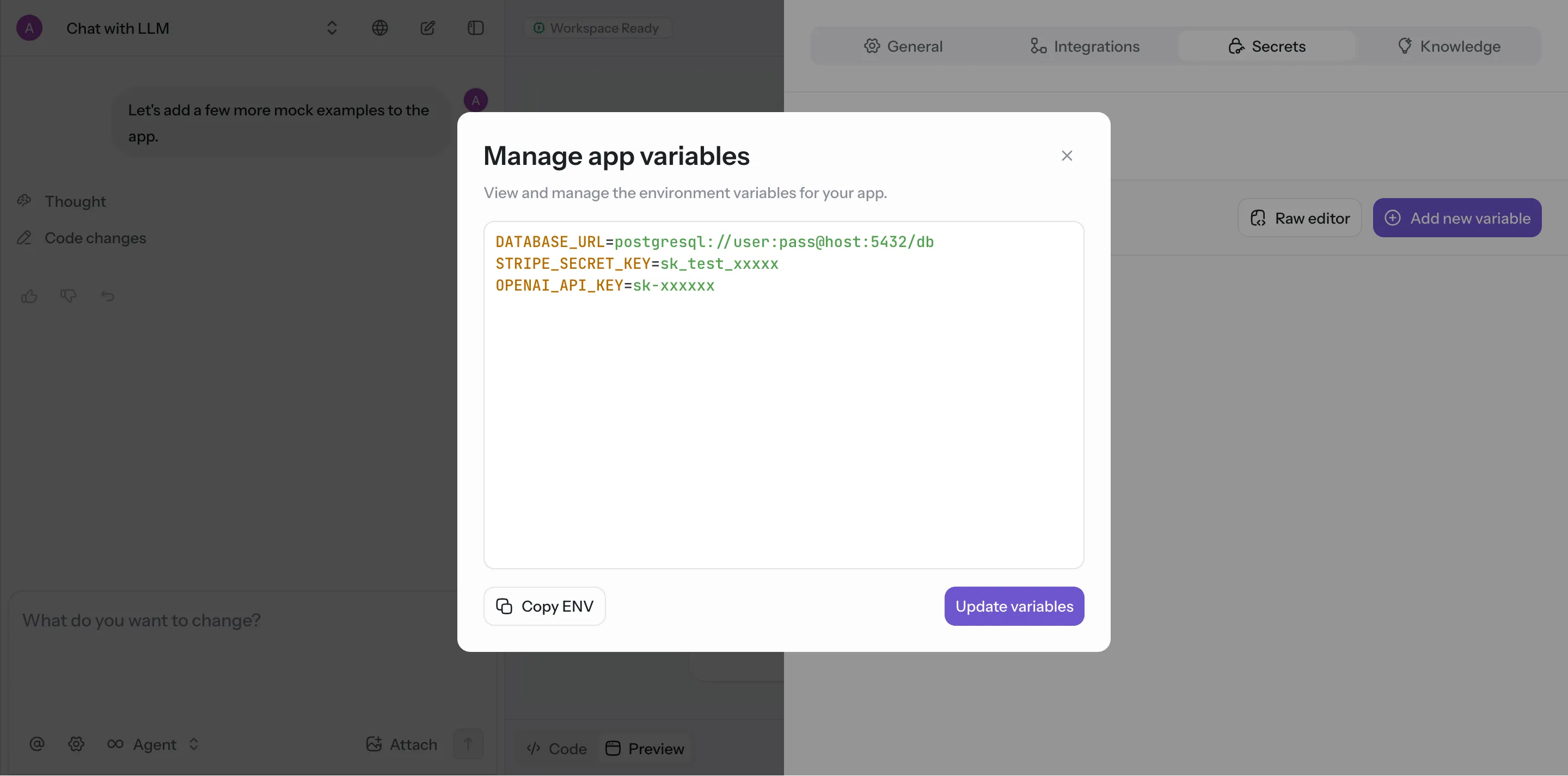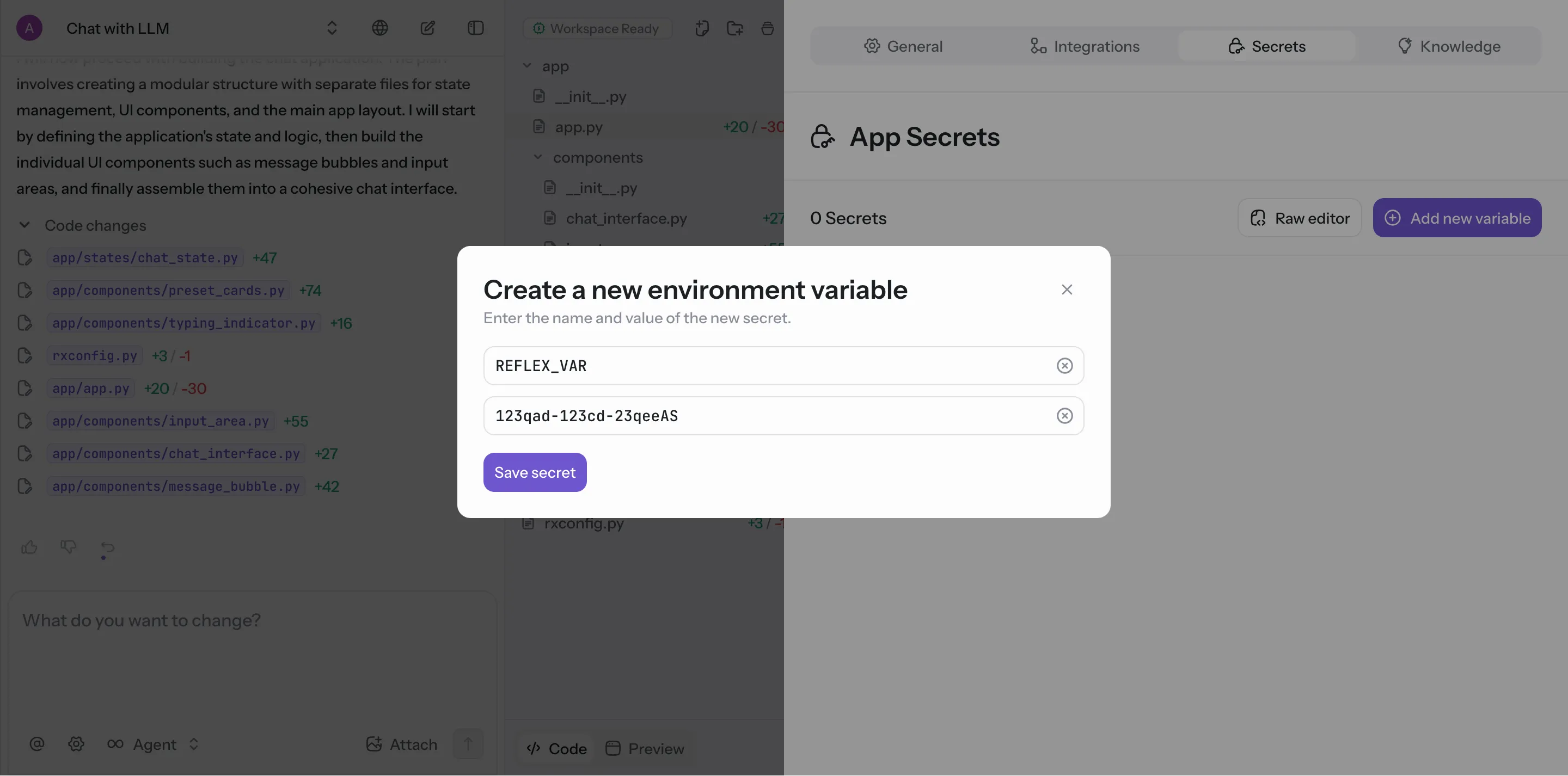 The Secrets feature allows you to securely store environment-specific values that your app can use, such as API keys, tokens, or other sensitive information.