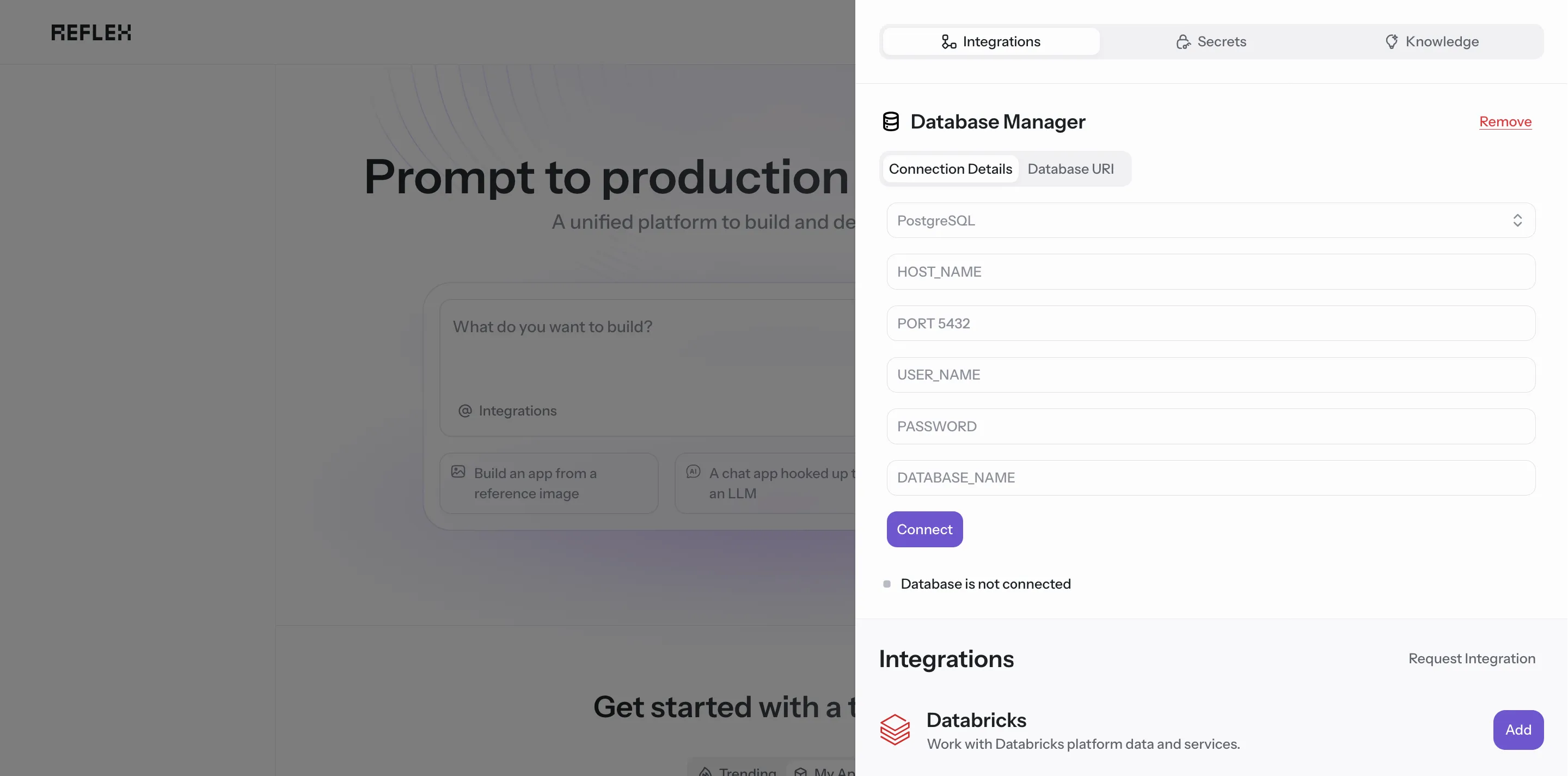 The Database Integration allows you to connect your AI-generated applications to real databases, automatically generating schemas and enabling data-driven functionality.