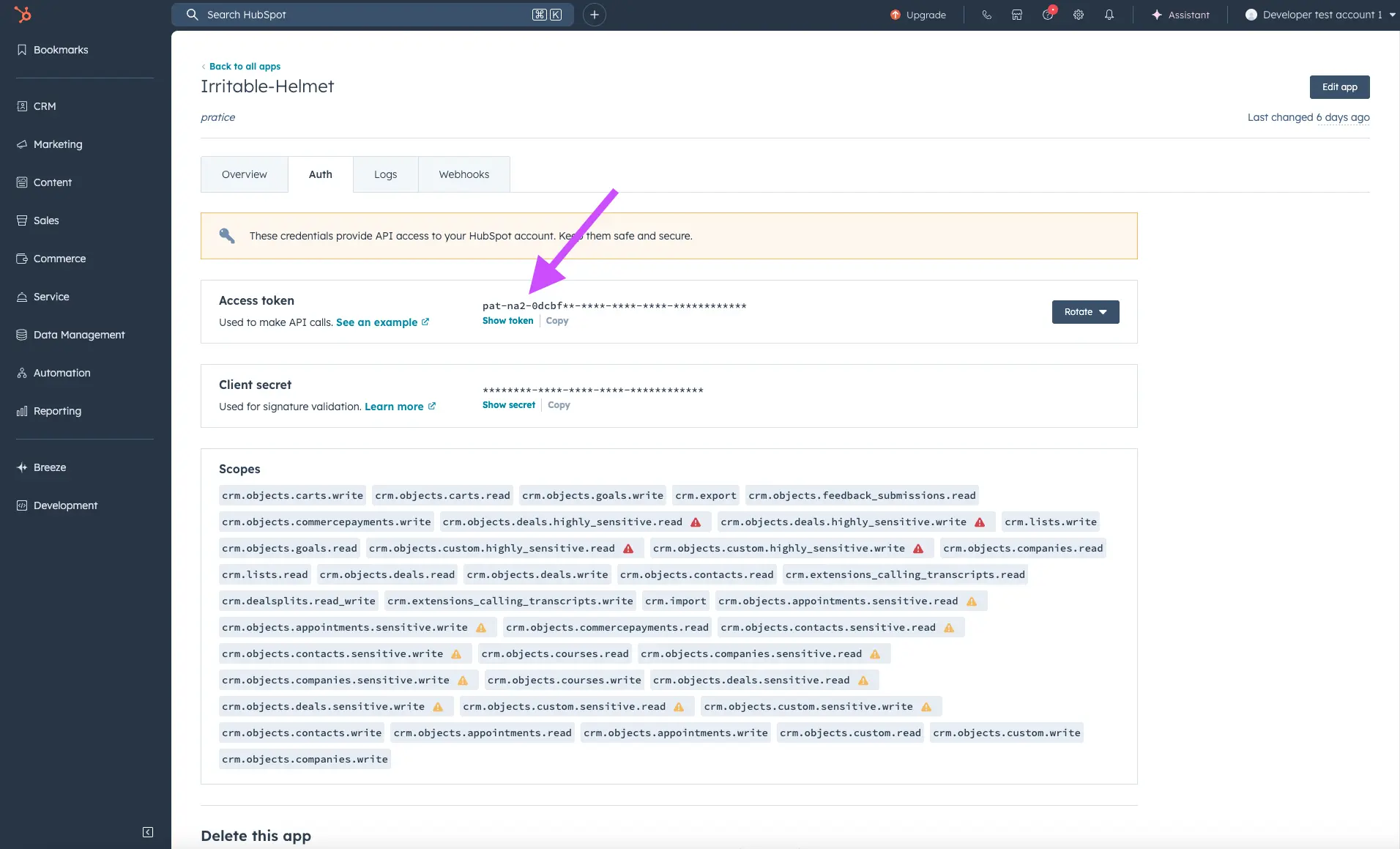 crm.objects.contacts.read/write,crm.schemas.companies.read), and save. - Copy the Access Token from the Auth tab.