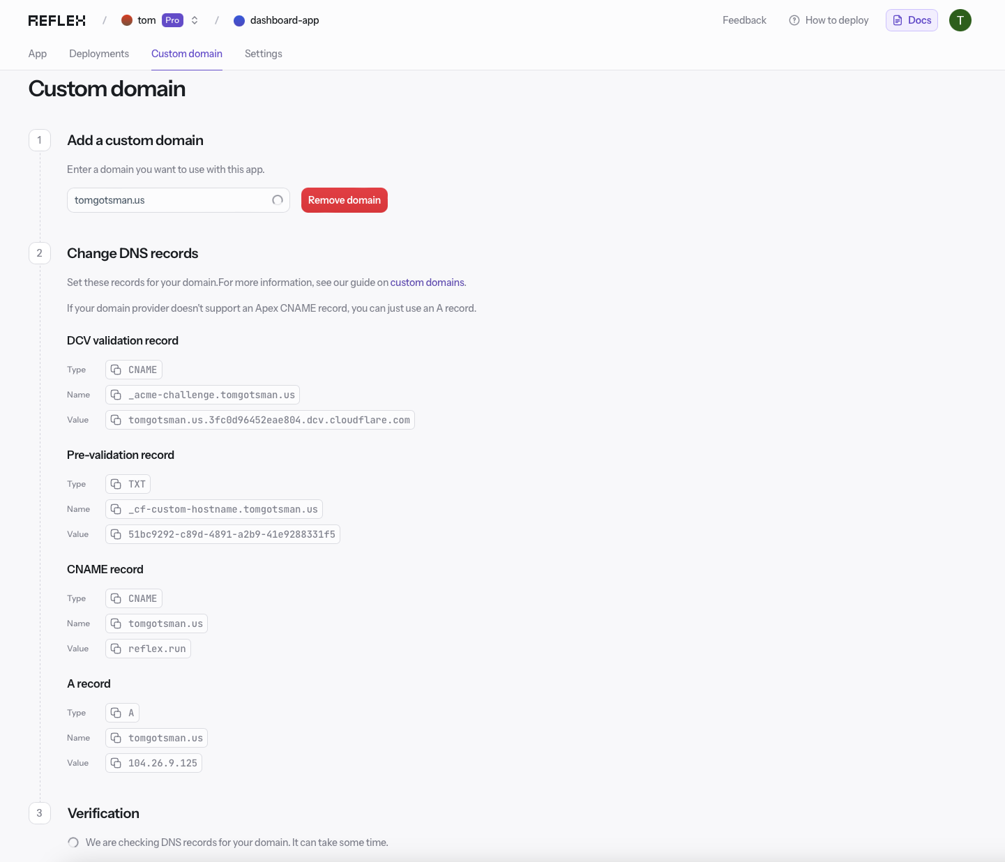 5 - Once you have added the DNS records, refresh the page on the Reflex Cloud page (it may take a few minutes to a few hours to update successfully). If the records are correct, you should see a success message like the one below: