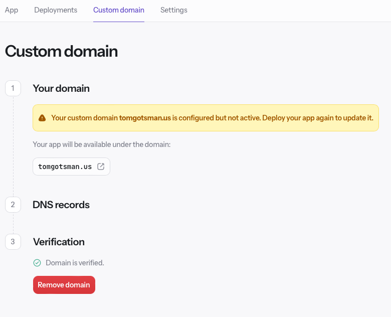 2 - Once your app is deployed click the Custom Domain tab and add your custom domain to the input field and press the Add domain button. You should now see a page like below: