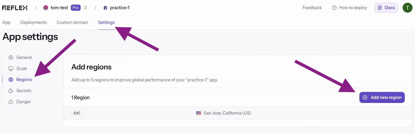 To scale your app to multiple regions in the Cloud UI, click on the Settings tab in the Cloud UI on the app page, and then click on the Regions tab as shown below. Clicking on the Add new region button will allow you to scale your app to multiple regions.